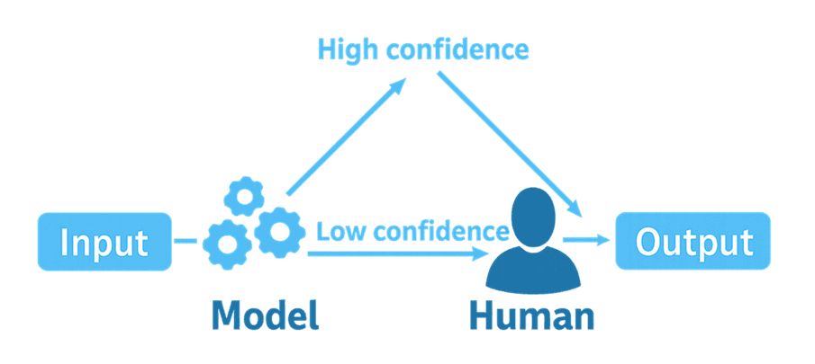 DifyのHuman in the Loopは、エージェント活用のスピードを落とさず、リスクを抑え、経営判断と接続できる、実践的なAI導入を推進できる新機能です。ただし、人による承認設計を誤れば形骸化し、組織が混乱し、結果としてAI活用が停滞する可能性もあります。そのバランスをとる基本設計は、多くのケースでは下図のようにAIの回答の信頼性が高い場合はそのまま進め、そうでない場合は人が介在するという分岐を含んだものになります。