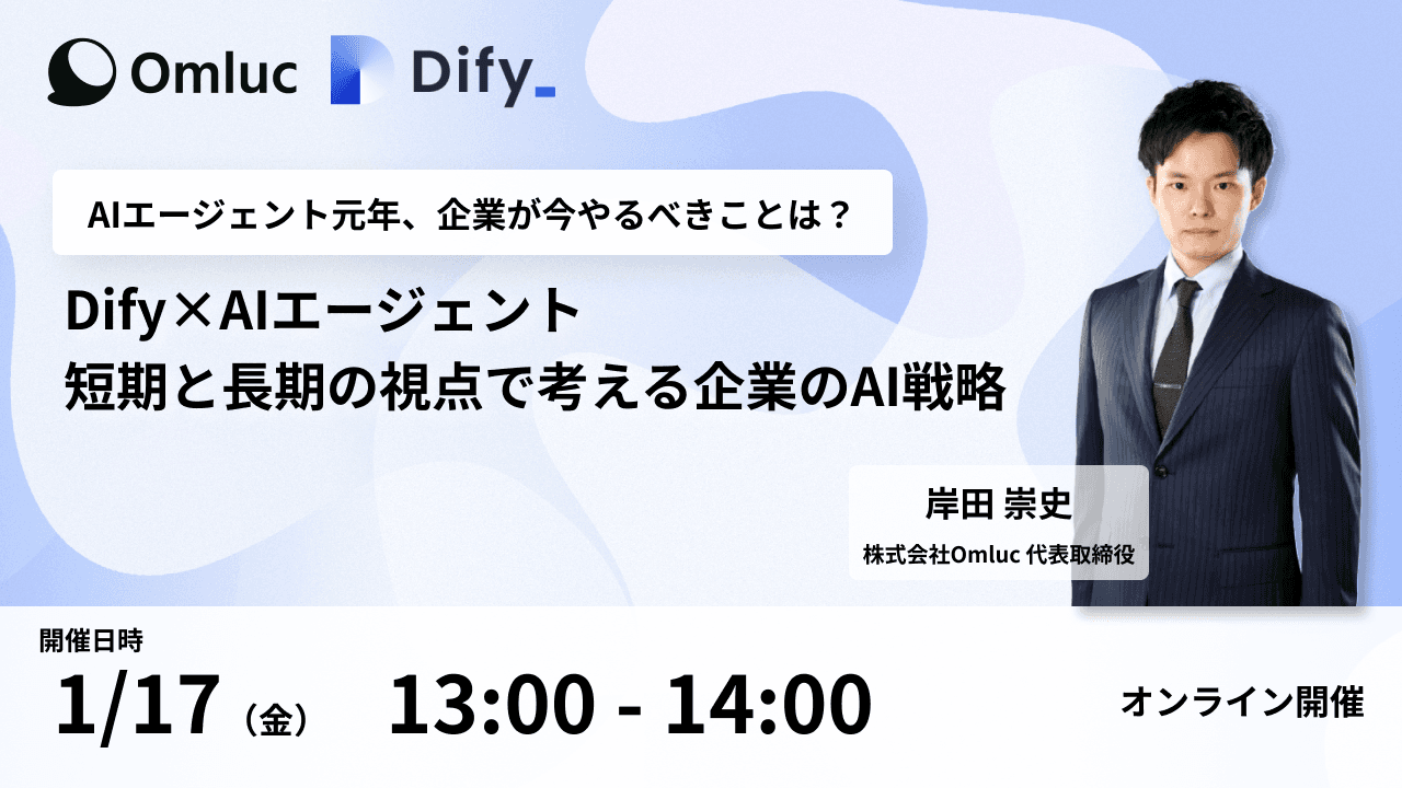 株式会社Omlucは「Dify×AIエージェント:短期的に業務効率化しながら、将来のAIエージェント時代に備える」をテーマにしたウェビナーを開催します。経営者様やDX・AI推進担当者様は必見です。詳しくは こちら からご覧いただけます。